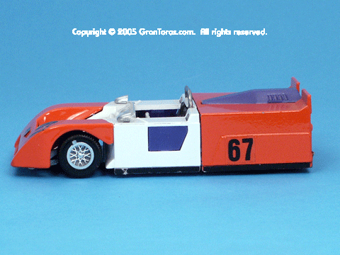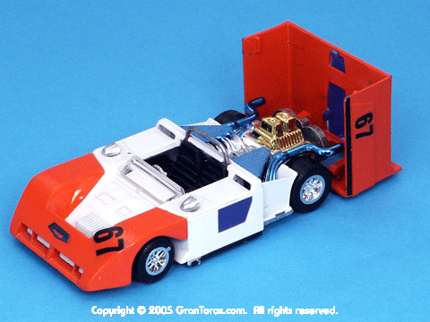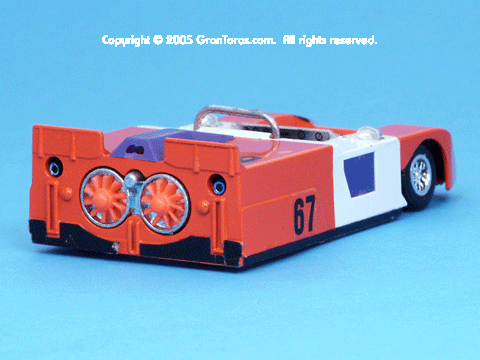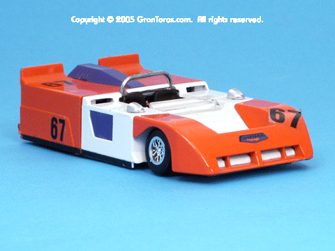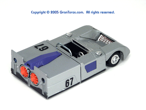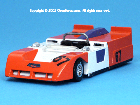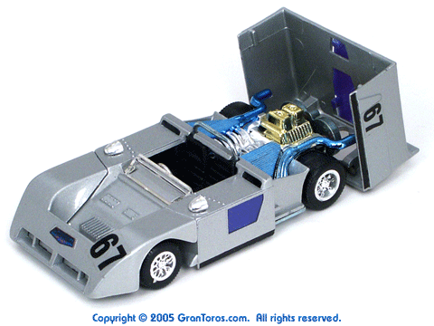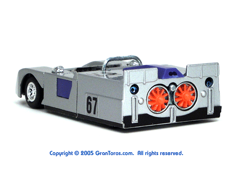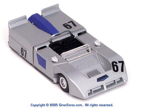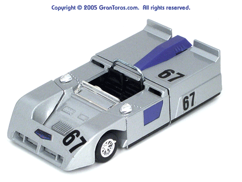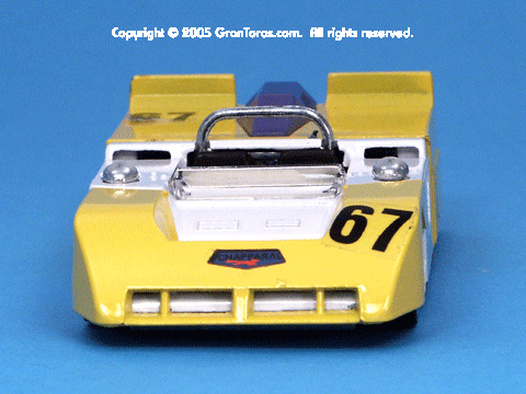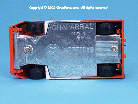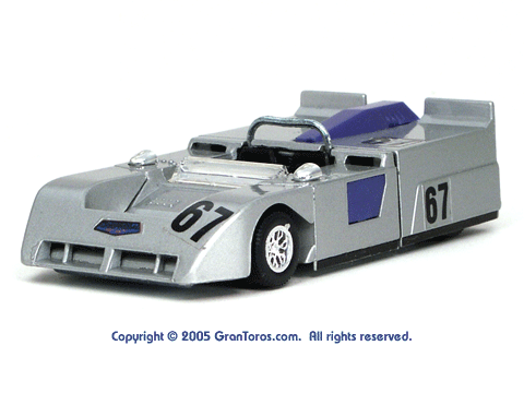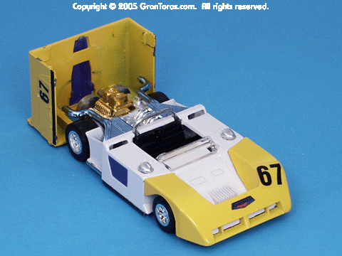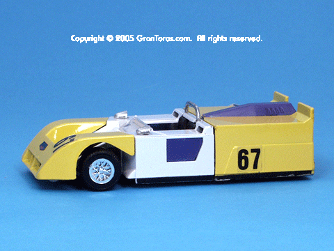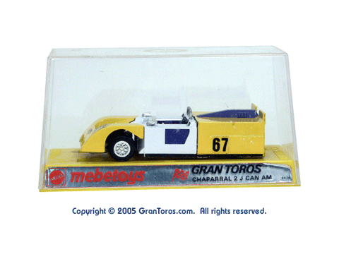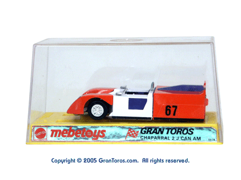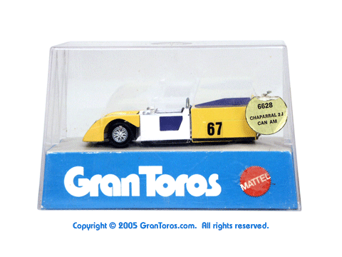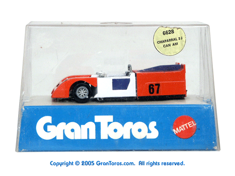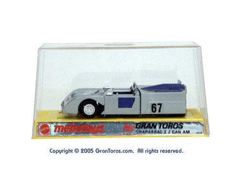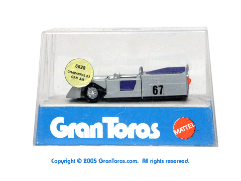 Gran Toros / Sputafuoco Chaparral CanAm 2JThe Chaparral 2J CanAm car, which first appeared in 1970, is arguably the most radical of the 1966 to 1974 CanAm race series. CanAm stood for the Canadian-American Challenge Cup which was jointly sponsored by the Canadian Automobile Sports Club (CASC) and the Sports Car Club of America (SCCA). When moving aerodynamic wings were banned, Jim Hall's Chaparral team employed an idea from a group of General Motors Chevrolet engineers to create downforce without the wings. They used a separate 274 cc Rockwell snowmobile engine to drive two large ducted fans and a Lexan (plexiglass) skirt around the base of the car to "suck" the air out of the car to create downforce. In effect, the 2J became a "suction cup" and was effective regardless of the car's speed. This innovative design, when working, dominated the CanAm series until it was banned by the International Automobile Federation (FIA) due to the Lexan skirts which moved up and down to conform to the track. All moving aerodynamic parts were banned because of the 2J. The Chaparral 2J's primary power plant was a normally aspirated V8 495 cubic inch (8112 cc) Chevrolet big block engine that generated over 700 horsepower. The Gran Toros Chaparral CanAM 2J, Mattel #6628, appeared in late 1972 and was first listed on the Italian Sputafuoco box but appeared in the 1972 Mebetoys catalog, 1972 Mattel Italian Dealers catalog, and the 1972 Japanese Gran Toros catalog. This model was made for the Gran Toros series only, it was never released as a "Mebetoys" model. This was the only true Hot Wheels Gran Toros model that did not bear either the Hot Wheels or Gran Toros logo. Clearly it is equipped with the Hot Wheels Gran Toros style wheels as well as being part of the Sputafuoco and Heisse Räder Supergross series. The real race car was white with silver mid section (where the white is on the two bright colored Gran Toros) and the ducted fans were silver with navy blue nacelles. For this reason many collectors repainted the model to match the actual race car. |