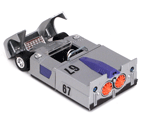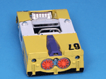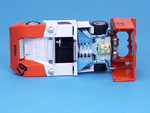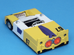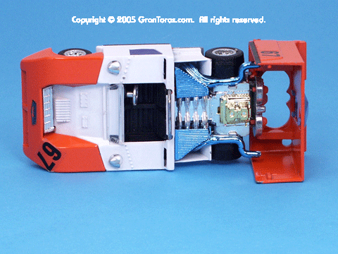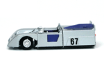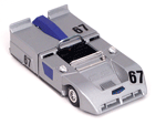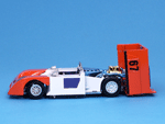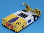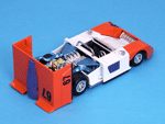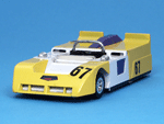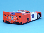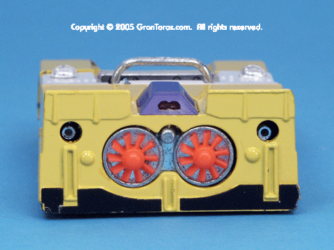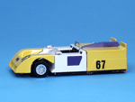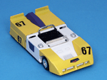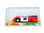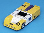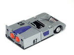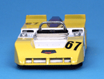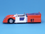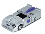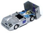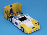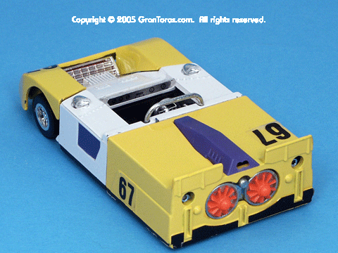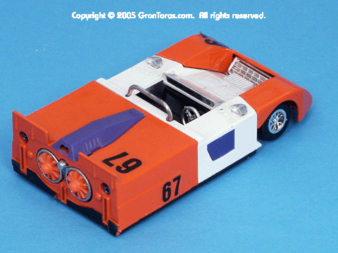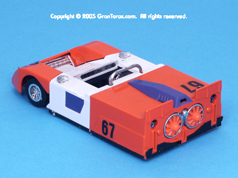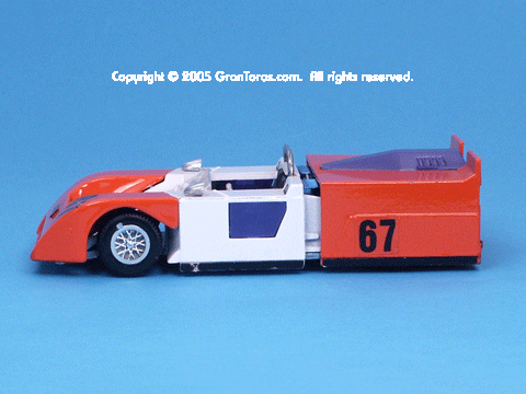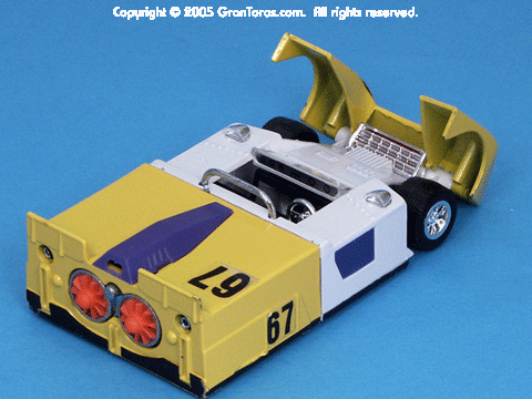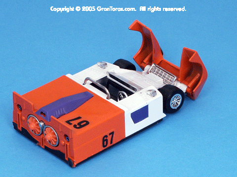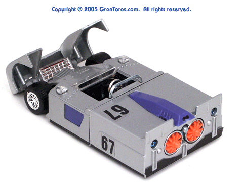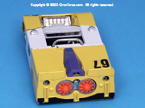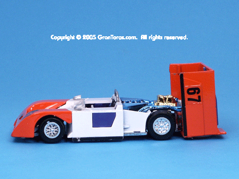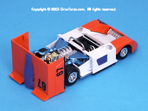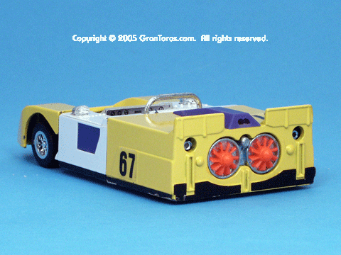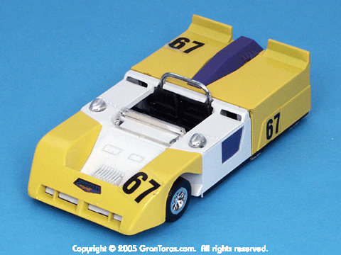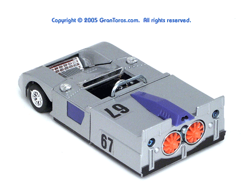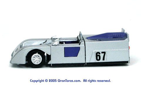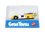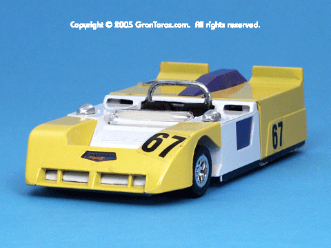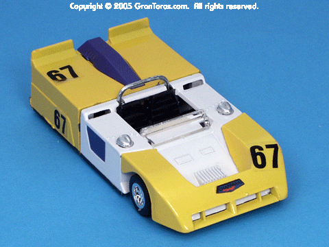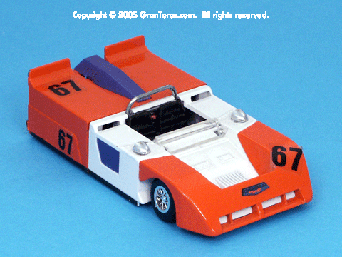 Gran Toros / Sputafuoco Chaparral CanAm 2JThe Chaparral 2J CanAm car, which first appeared in 1970, is arguably the most radical of the 1966 to 1974 CanAm race series. CanAm stood for the Canadian-American Challenge Cup which was jointly sponsored by the Canadian Automobile Sports Club (CASC) and the Sports Car Club of America (SCCA). When moving aerodynamic wings were banned, Jim Hall's Chaparral team employed an idea from a group of General Motors Chevrolet engineers to create downforce without the wings. They used a separate 274 cc Rockwell snowmobile engine to drive two large ducted fans and a Lexan (plexiglass) skirt around the base of the car to "suck" the air out of the car to create downforce. In effect, the 2J became a "suction cup" and was effective regardless of the car's speed. This innovative design, when working, dominated the CanAm series until it was banned by the International Automobile Federation (FIA) due to the Lexan skirts which moved up and down to conform to the track. All moving aerodynamic parts were banned because of the 2J. The Chaparral 2J's primary power plant was a normally aspirated V8 495 cubic inch (8112 cc) Chevrolet big block engine that generated over 700 horsepower. The Gran Toros Chaparral CanAM 2J, Mattel #6628, appeared in late 1972 and was first listed on the Italian Sputafuoco box but appeared in the 1972 Mebetoys catalog, 1972 Mattel Italian Dealers catalog, and the 1972 Japanese Gran Toros catalog. This model was made for the Gran Toros series only, it was never released as a "Mebetoys" model. This was the only true Hot Wheels Gran Toros model that did not bear either the Hot Wheels or Gran Toros logo. Clearly it is equipped with the Hot Wheels Gran Toros style wheels as well as being part of the Sputafuoco and Heisse Räder Supergross series. The real race car was white with silver mid section (where the white is on the two bright colored Gran Toros) and the ducted fans were silver with navy blue nacelles. For this reason many collectors repainted the model to match the actual race car. |