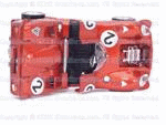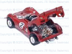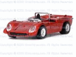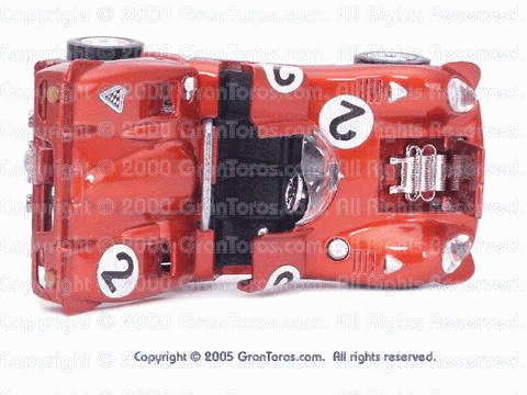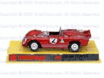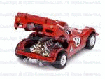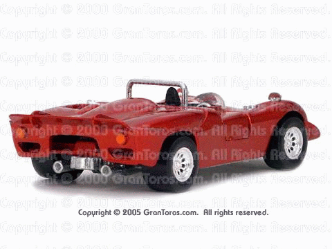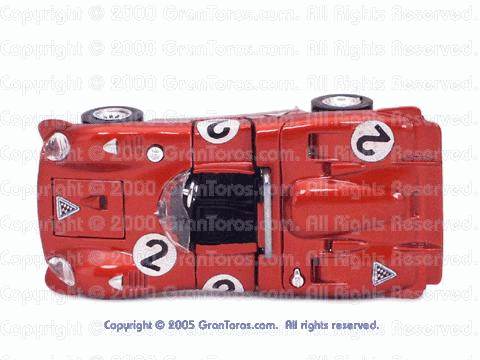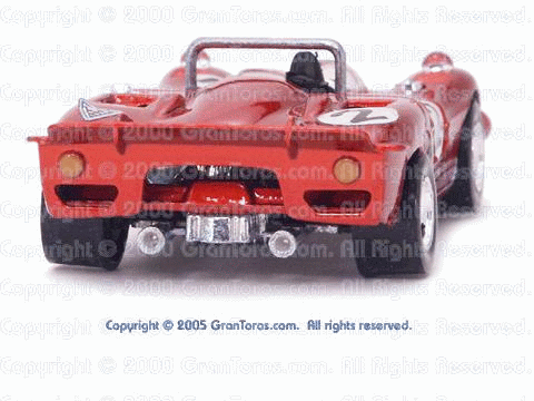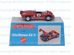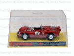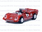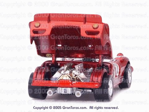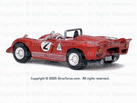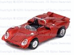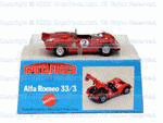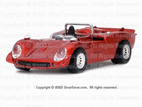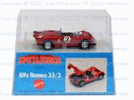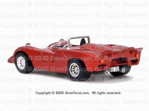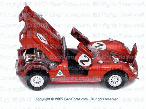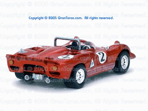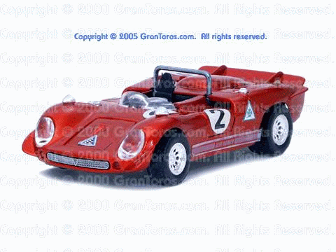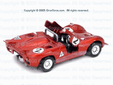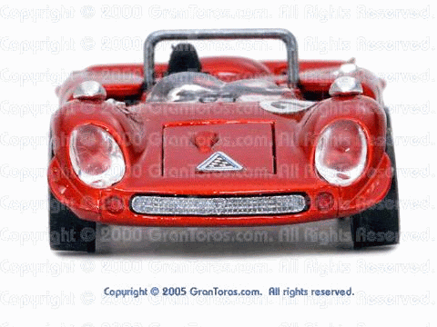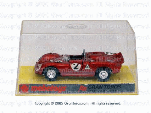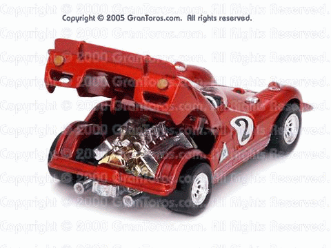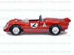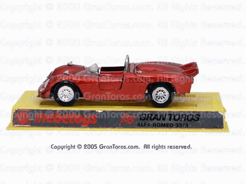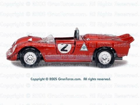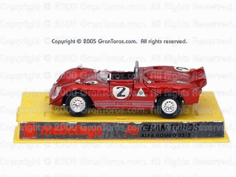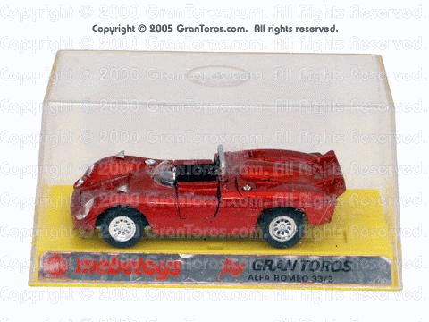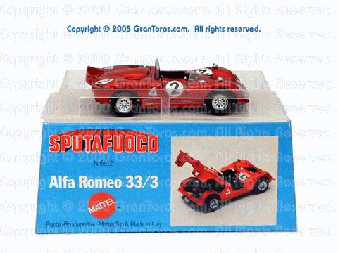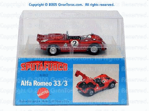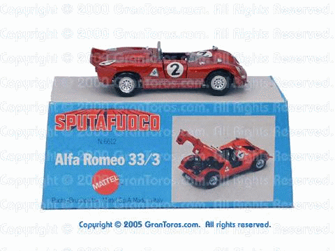 Gran Toros / Sputafuoco Alfa Romeo 33/3The Alfa Romeo Type 33 race cars were made between 1969 and 1972 and featured rear-mounted 2998 cc (183 cubic inch) V8 engines and a tubular aluminum chassis. The Alfa 33/3 (Type 33 / 3-Litre) appeared in 1969 and began racing on the international racing scene in 1970. The 33/3 had a 3-litre engine that generated up to 400 horsepower, a 6-speed transmission, and 15-inch rear wheels. A replica of the Alfa Romeo 33/3 racing car, this Gran Toros model, Mattel # 6612, was created for the Gran Toros Hot Wheels Super Racers series and never released in the "Mebetoys" series. One of the original Gran Toros, it was part of the Sputafuoco and Heisse Räder Supergorss series and first appeared on the bottom of the North American Gran Toros box, the 1970 Mattel Toyfair catalog, the 1970 Mattel Italian Dealer catalog and the 1970 Hot Wheels International catalog. This Gran Toros model featured opening doors and compartments, different wheel hubs from the other Gran Toros models, and white and yellow/gold chrome plated engine. The Gran Toros Alfa Romeo 33/3 was one of the most common models in the series and was issued in the metallic red color. |