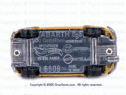 The base on this yellow ochre Gran Toros Abarth 695ss does not have the Hot Wheels or Mattel logos. You typically see this on the early castings. |