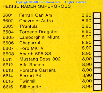 Close-up of the Gran Toros (Heisse Räder Supergross) model list (Part 2) from the back cover. It lists the following Gran Toros models: