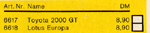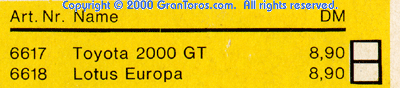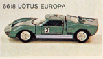 The Lotus Europa picture is of a Mebetoys Model #A-39. Note the rubber wheels and lack of "Spring-Bar" suspension. |