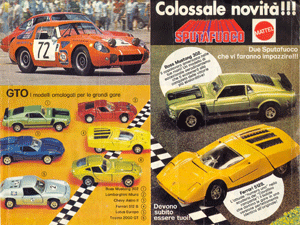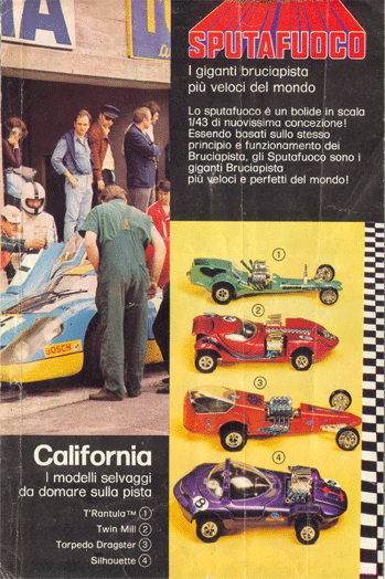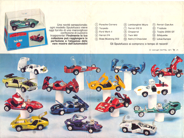 This full-color "pull-out" Italian magazine advertisement appeared in Italy in 1971. It shows 15 of the Hot Wheels Gran Toros models. Mattel S.p.A. separated the models into three groups: California, Prototypes, GTO.