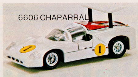 The Chaparral picture is of Mebetoys model #A-23. Note the rubber wheels and lack of "Spring-Bar" suspension. |