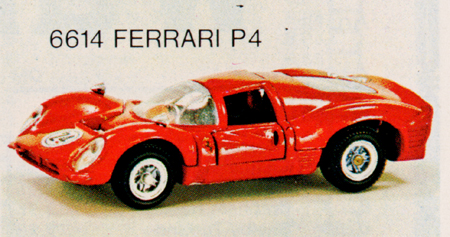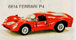The Ferrari P4 picture is of Mebetoys model #A-27. Note the rubber wheels and lack of "Spring-Bar" suspension. |