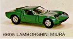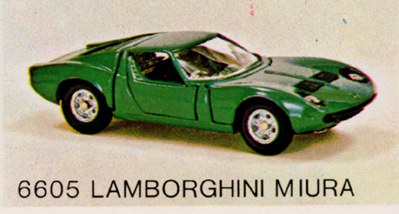 The Lamborghini Miura picture is of Mebetoys model #A-20. Note the rubber wheels and lack of "Spring-Bar" suspension. |