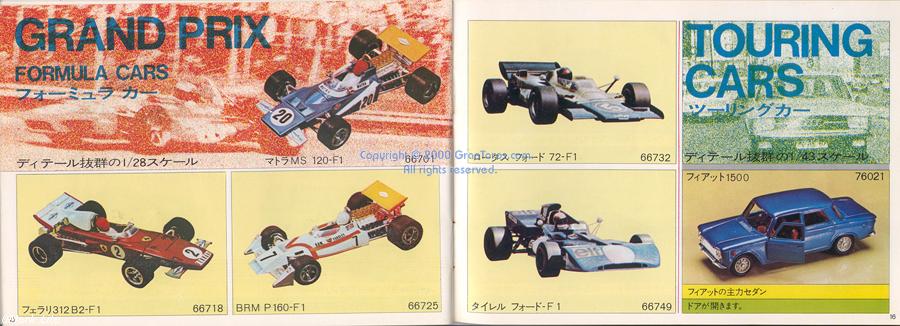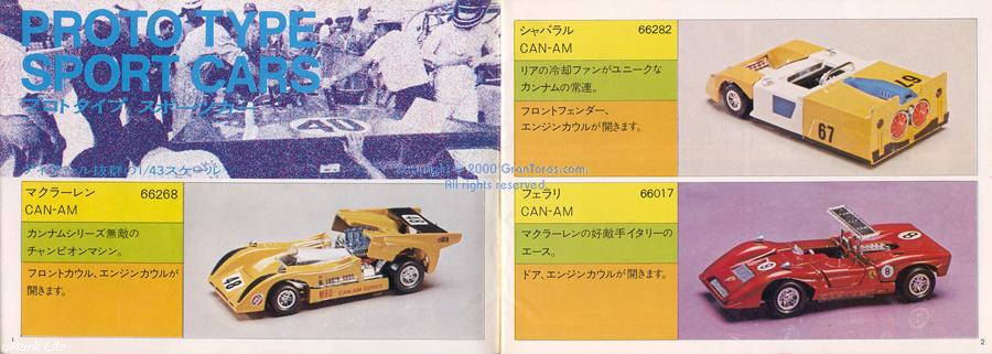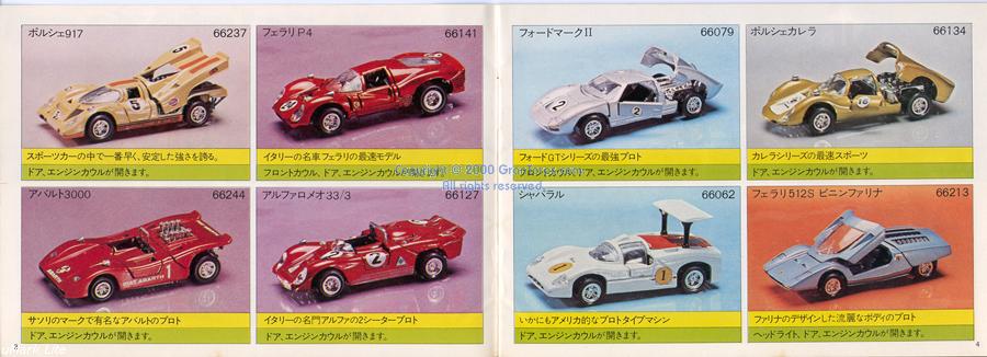 The Gran Toros Porsche 917, Model #6623, Ferrari P4, Model #6614, Abarth 3000SP, Model #6624, Alfa Romeo 33/3, Model #6612, Ford Mk II, Model #6607, Porsche Carrera 10, Model #6613, Chaparral, Model #6606, and Ferrari 512s, Model #6621.