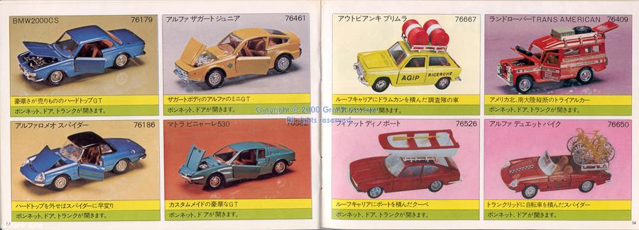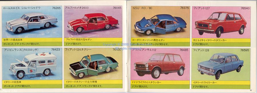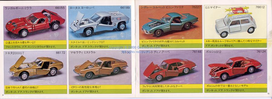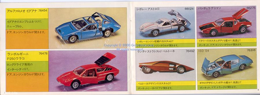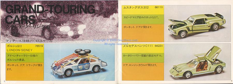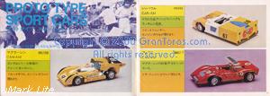 This page shows the 1972 Japanese Gran Toros catalog. 1972 was when Mattel S.p.A. began to discontinue the Hot Wheels Gran Toros line (Series Sputafuoco) and split the Mebetoys line into Series Mebetoys, Series Gran Super, Series Europa, and Series Gran Toros (non-Hot Wheels Gran Toros, also known as Sputafuoco. The catalog shows a mix of Sputafuoco Hot Wheels Gran Toros models and the post Sputafuoco models packaged under the Gran Toros name for the European market. |