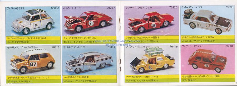 The Mini Cooper Rallye, Model #A-31, Porsche 912 Rallye, Model #A-33, Opel Kadett Rallye, Model #A-34, Lancia Fulvia Rallye, Model #A-32, Fiat 124s Raid, Model #A-41, Fiat 127 Rallye, Model #A-68, and BMW Alpine Rallye, Model #A-63, are Mebetoys series models that were packaged under the Gran Toros name after Mattel S.p.A. (Mebetoys) discontinued the Sputafuoco (Gran Toros) name in Europe. |