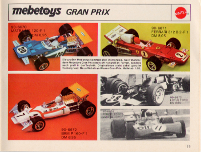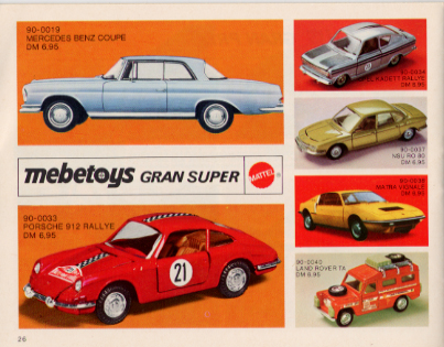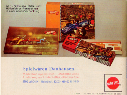 This page shows the 1972 / 1973 Mattel German Heisse Räder Catalog. Due to the size of the catalog, this page only shows the Hot Wheels (Redlines) Gran Toros / Sputafuoco / Heisse Räder Supergross, and Mebetoys pages.