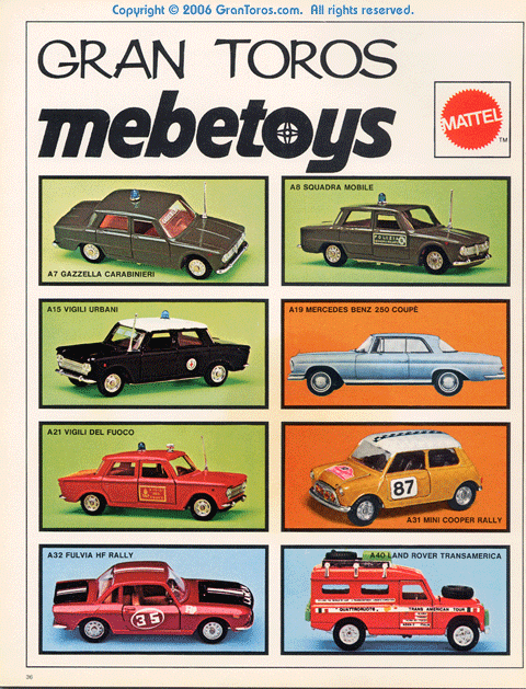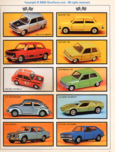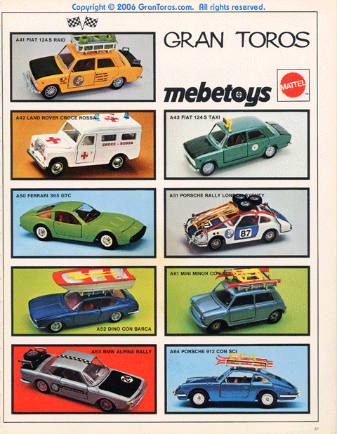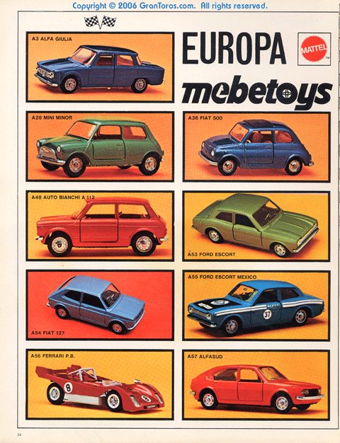 Page 35 of the 1974 Mattel Italian Giocattoli Dealer's catalog showing the following Mebetoys Series Europa models:
