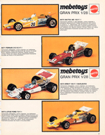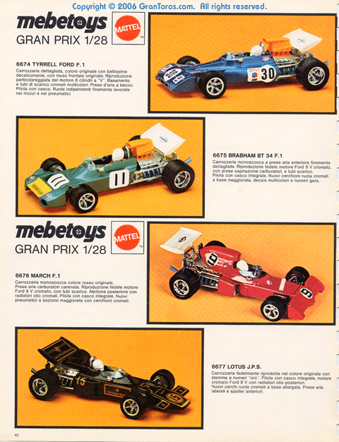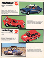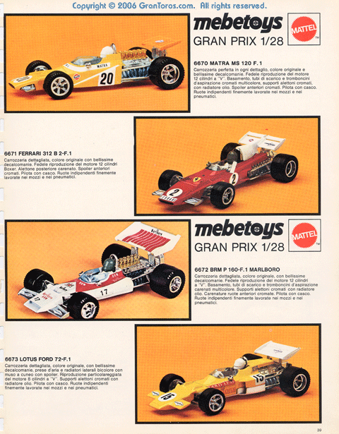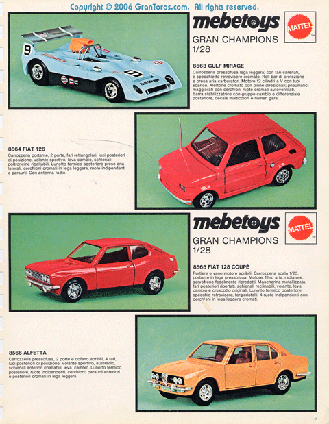 Page 41 of the 1974 Mattel Italian Giocattoli Dealer's catalog announcing the 1/28 scale Gran Champions and showing the following Gran Champions models: