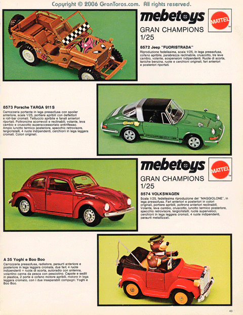 Page 43 of the 1974 Mattel Italian Giocattoli Dealer's catalog showing the following Gran Champions models:
