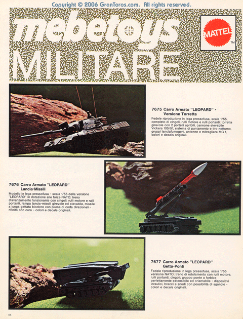 Page 44 of the 1974 Mattel Italian Giocattoli Dealer's catalog showing the following Mebetoys military models: