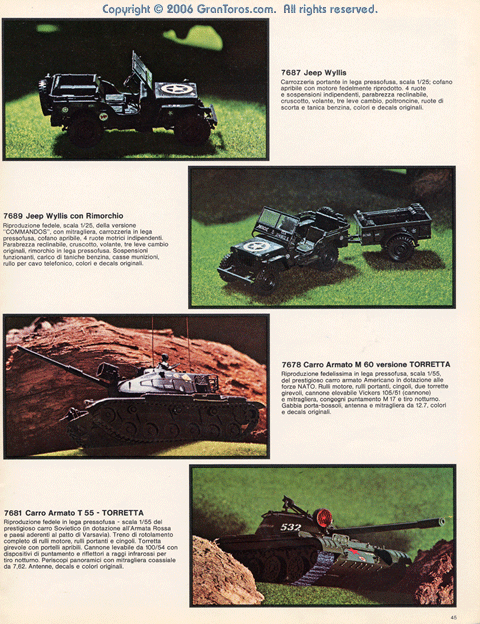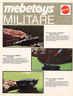 Page 45 of the 1974 Mattel Italian Giocattoli Dealer's catalog showing hte following Mebetoys military models: