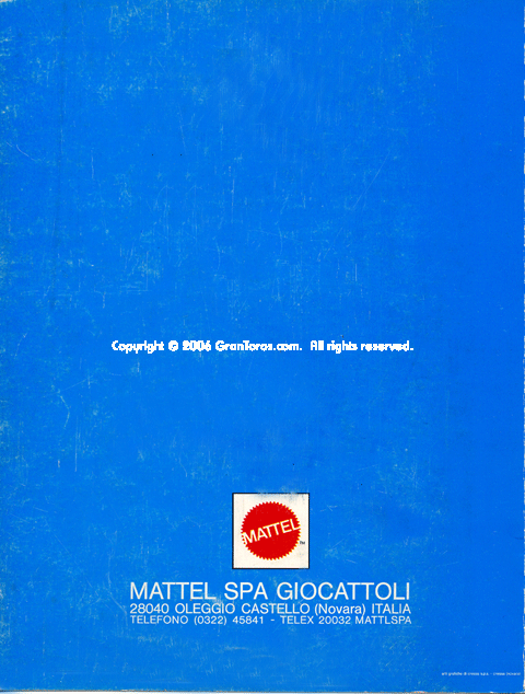 The back cover of the 1974 Mattel Italian Giocattoli Dealer's catalog.