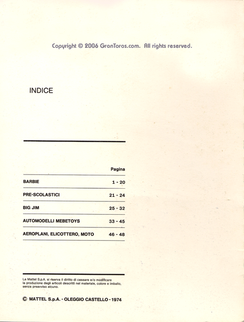The 1974 Mattel Italian Giocattoli Dealer's catalog Index.