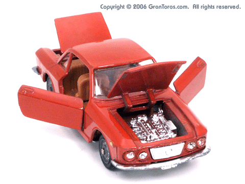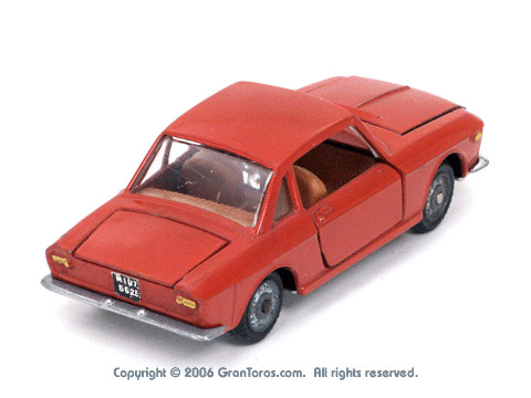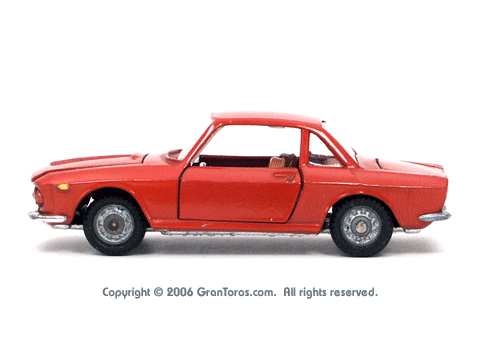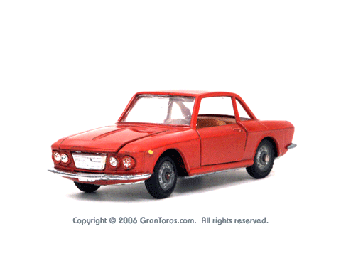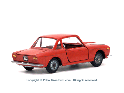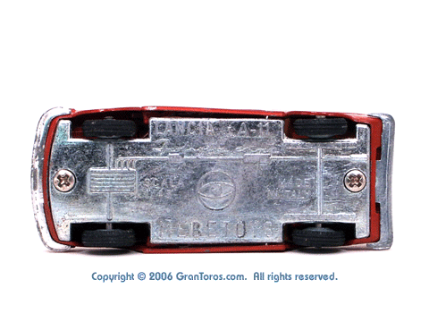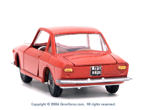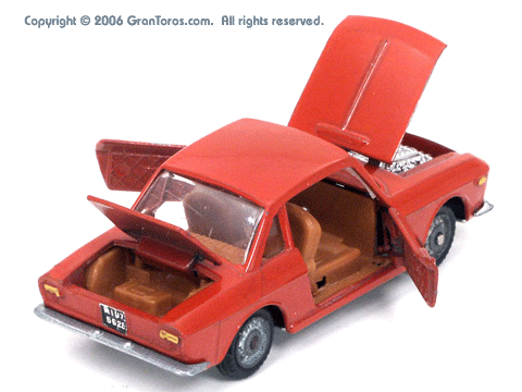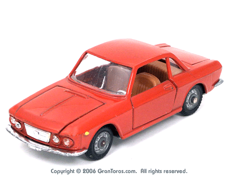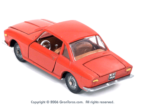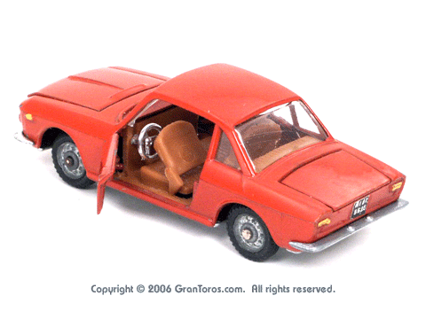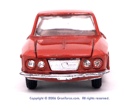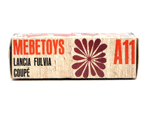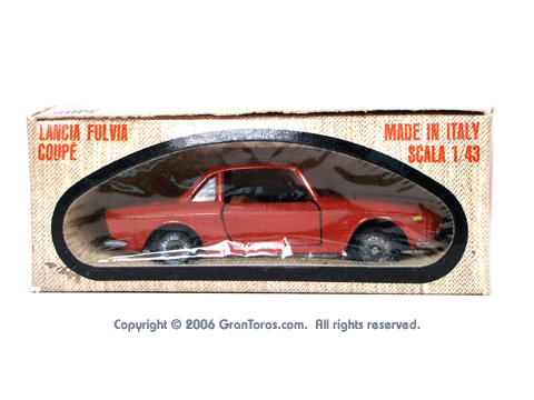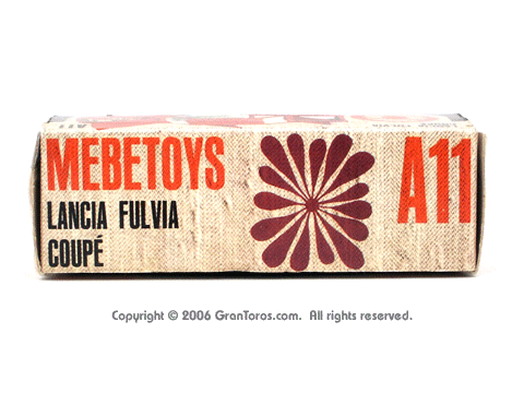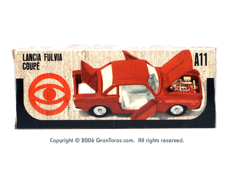 Mebetoys Model #A-11, Lancia FulviaThe Italian Lancia Fulvia was introduced at the 1963 Geneva Motor Show. Lancia produced it until FIAT took over production through 1976. Fulvias are popular for their racing history, which included winning the International Rally Championship in 1972. This is one of the first models in the Mebetoys series and appeared in 1966. It first appeard in the 1966 catalog sheet included with the model and the 1967 Mebetoys catalog, and continued to appear in Mebetoys catalogs until 1973. This model served as the "base model" for the Lancia Fulvia HF Rallye, Mebetoys Model #A-32, the Lancia Fulvia HF Marlboro, Mebetoys Model #A-73, and the Fulvia HF Alitalia, Mebetoys Model #A-91. Although a very popular model in Europe it was never issued as a Hot Wheels Gran Toros series model nor packaged under the Gran Toros name. |
