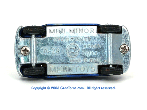 view of a Mebetoys Mini Minor, Model #A-28, showing the markings. |