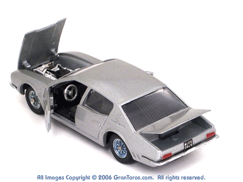 Left rear top quarter view of a Mebetoys ISO Rivolta S4, Model #A-30, with all doors and compartments open. |