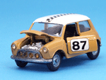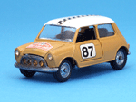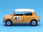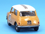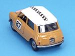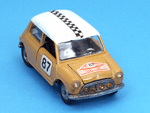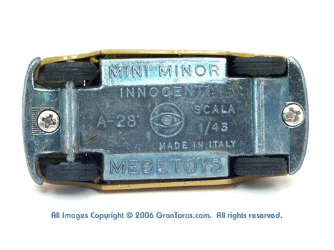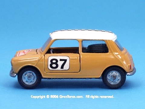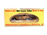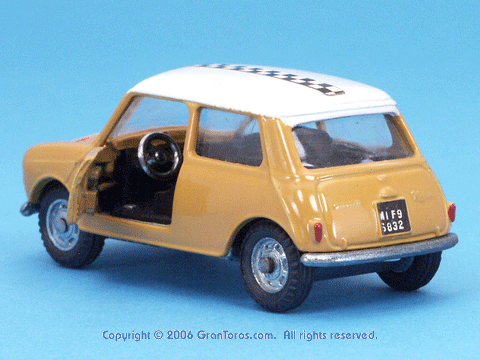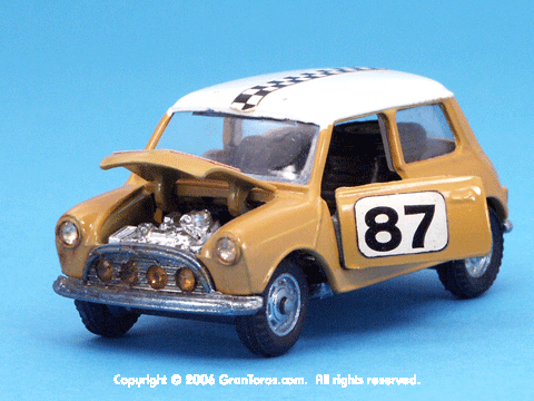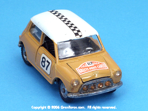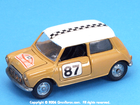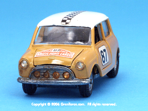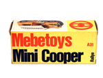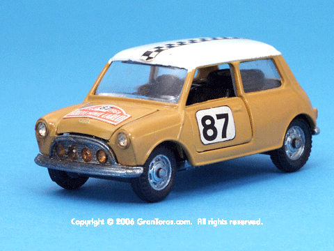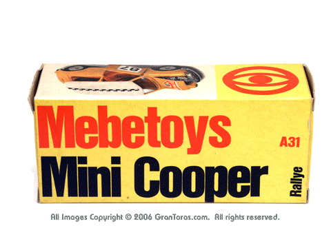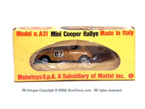 Mebetoys Model #A-31, Mini Cooper RallyeThe Mini Minor is a small popular British-made car that was designed by Sir Alec Issigonis and produced by the British Motor Corporation (BMC) and its successors from 1959 to 2000. John Cooper, friend of Sir Alec Issigonis and the owner of the Cooper Car Company, which designed and built Formula 1 and rally cars, collaborated with Sir Alec Issigonis and BMC to create the Mini Cooper. The Mini Cooper S, with its larger 1275 cc engine, won the Monte Carlo Rally in 1964, 1965, and 1967. This is one of the early models in the Mebetoys series and appeared in 1969. It first appeard in the 1969 Mebetoys catalog and continued to appear in Mebetoys catalogs until 1974.This model used the Mebetoys Mini Minor, Model #A-28, as the base model to create the Rallye. Indeed, the base of the Mini Cooper Rallye bears the A-28 model number. Four holes were drilled into the front grille to accomodate four jeweled amber "lights" and stickers were added to create the Rallye. Although a very popular model in Europe it was never issued as a Hot Wheels Gran Toros series model nor packaged under the Gran Toros or Sputafuoco name. |