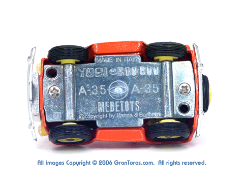 Bottom view of a Mebetoys Yogi e Boo Boo, Model #A-35 showing the markings The two holes fit onto two two "pins" on the package base to secre the model. |