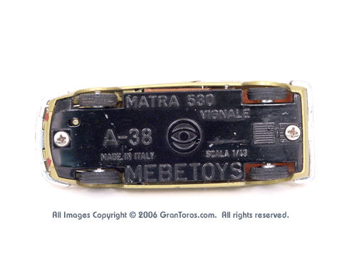 Bottom view of a Mebetoys Matra Vignale 530, Model #A-38, showing the markings. |