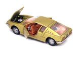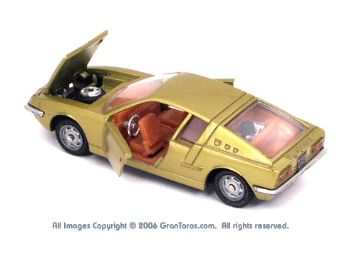 Left top view of a Mebetoys Matra Vignale 530, Model #A-38, with open doors and bonnet (hood). |