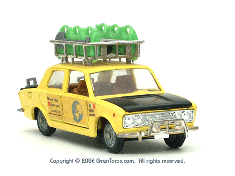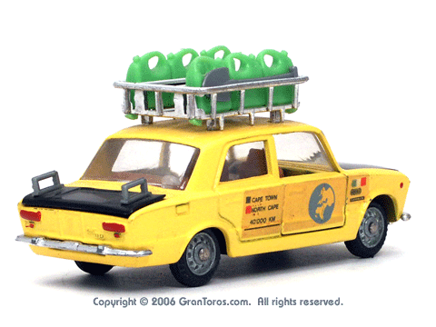Left rear quarter view of a Mebetoys Fiat 124 S Raid, Model #A-41. |