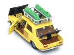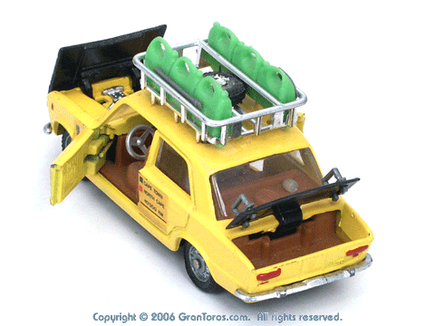 Left top rear quarter view of a Mebetoys Fiat 124 S Raid, Model #A-41, with open doors and compartments. |