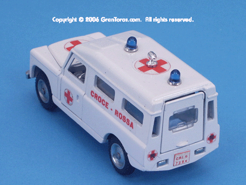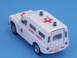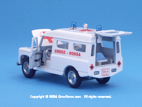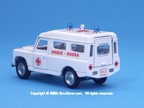 Right rear quarter view of a Mebetoys Land Rover Croce Rossa, Model #A-42.