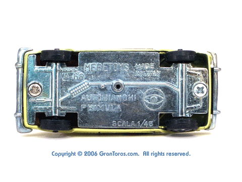 Bottom view of a Mebetoys Primula Agip, Model #A-66, showing the markings. |
