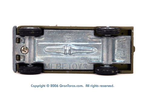 Bottom view of a Mebetoys Land Rover Militare (Army), Model #A-67, showing the markings. |