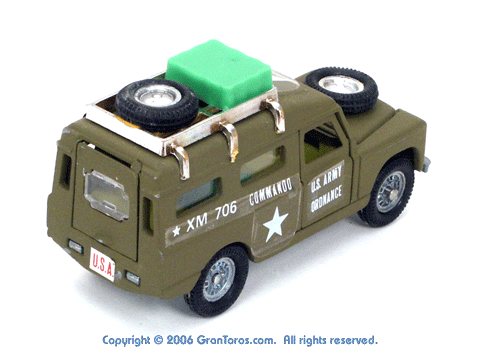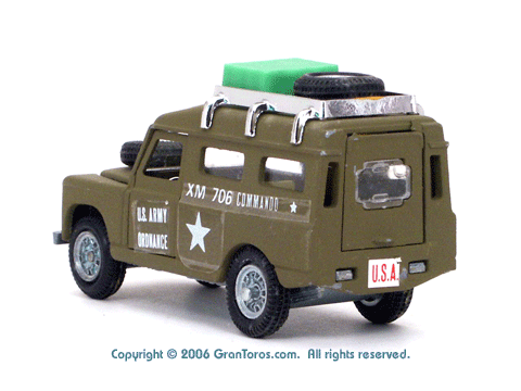Right rear quarter view of a Mebetoys Land Rover Militare (Army), Model #A-67. |