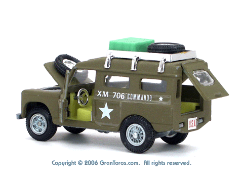 Left side quarter view of a Mebetoys Land Rover Militare (Army), Model #A-67, with open doors and compartments. |
