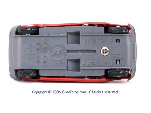Bottom view of a Mebetoys Renault 5 TL, Model #A-69, showing the markings. |