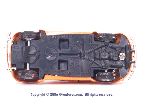 Bottom view of a Mebetoys Volkswagen 1303, Maggilino, showing the markings. |