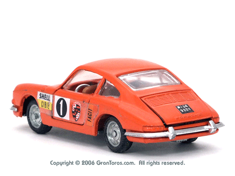 Right rear quarter view of a Mebetoys Porsche 911S Rally LT 27 Rallye, Model #A-78. |