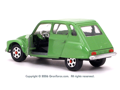 Left rear quarter view of a Mebetoys Citroën Dyane, Model #A-84, with open door. |