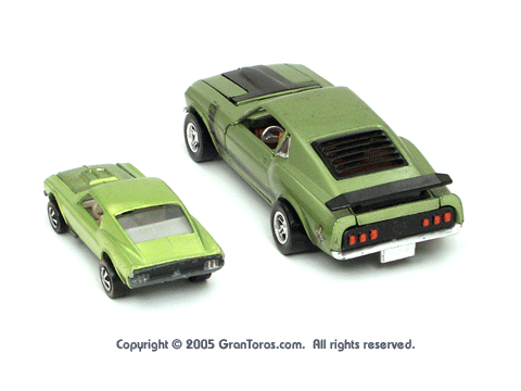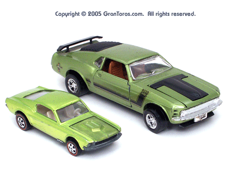 Green Gran Toros Mustang Boss 302 next to an original Hot Wheels Custom Mustang (Redline). |
