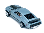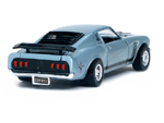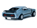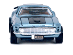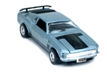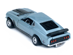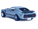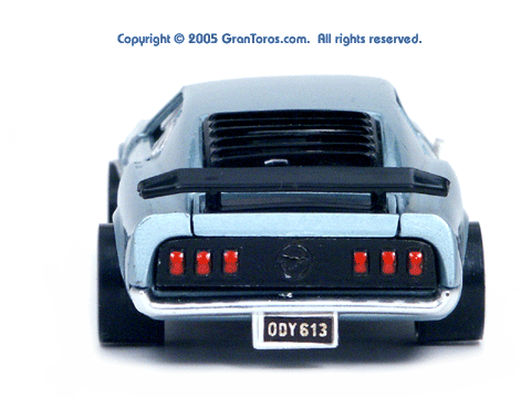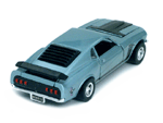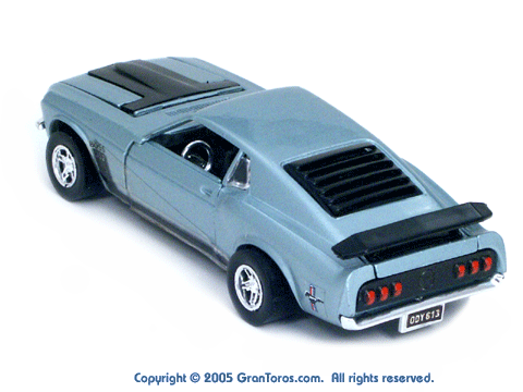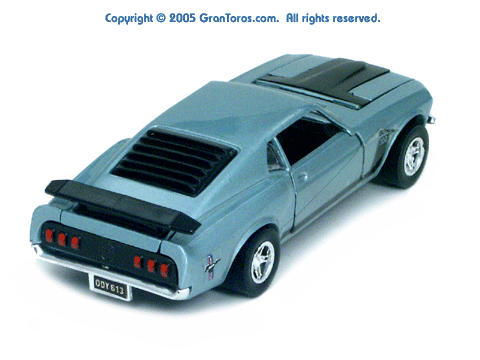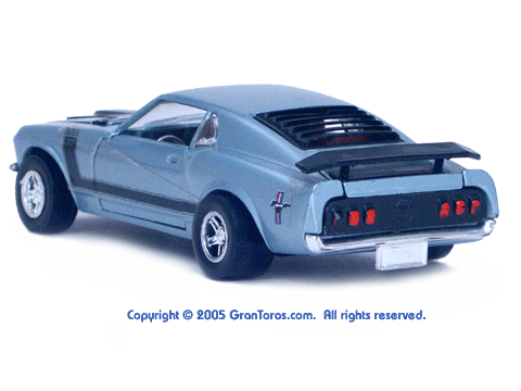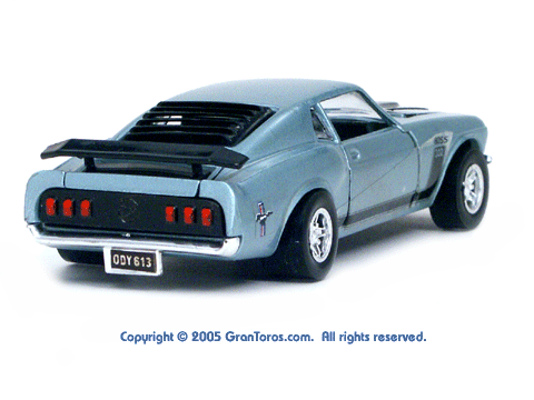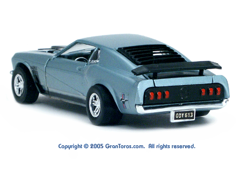 Rear view of a light blue Gran Toros Mustang Boss 302 with black interior. |