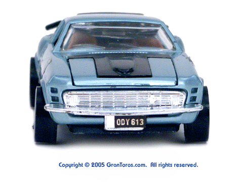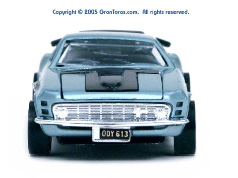 Head-on front view of a light blue Gran Toros Mustang Boss 302 with black interior. |