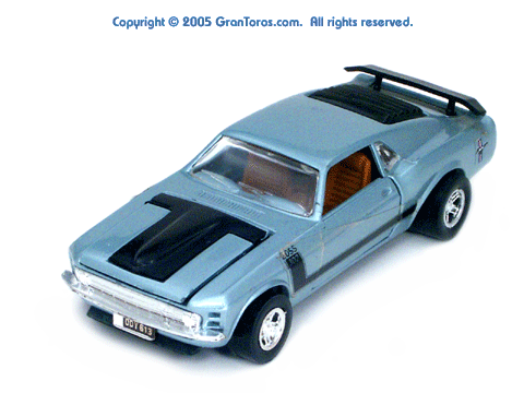Top left front quarter view of a light blue Gran Toros Mustang Boss 302 with brown interior. |