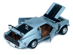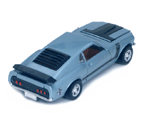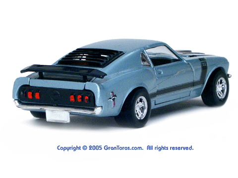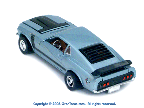 Top right rear quarter view of a light blue Gran Toros Mustang Boss 302 with black interior. |