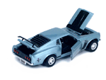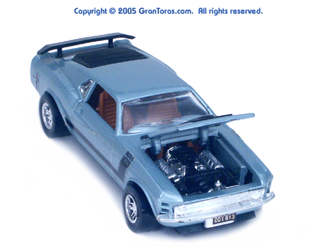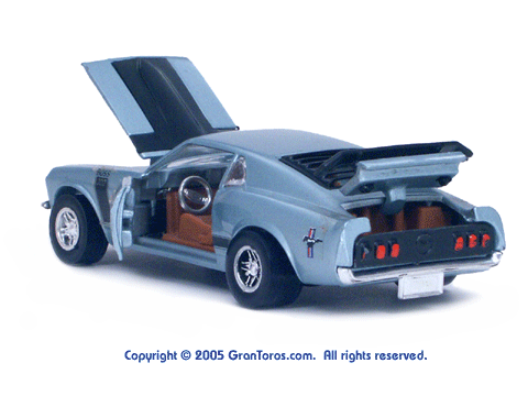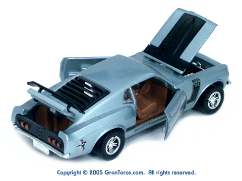 Black interior light blue Gran Toros Mustang Boss 302 with open doors, hood and trunk. |