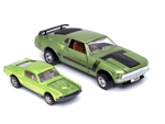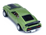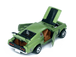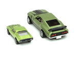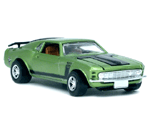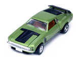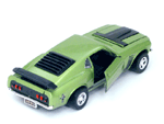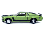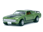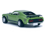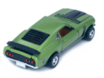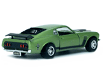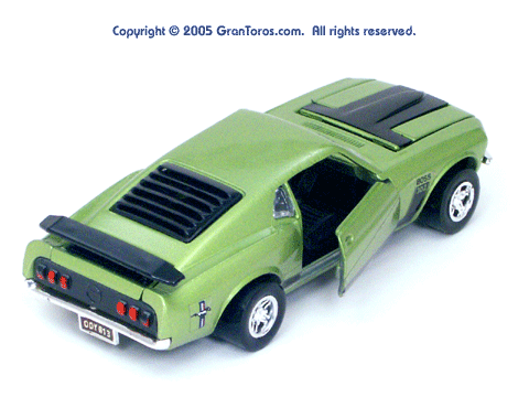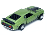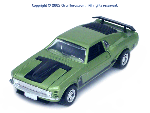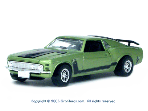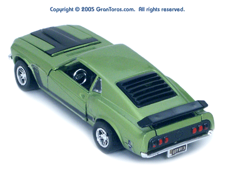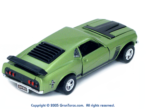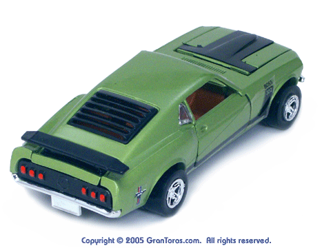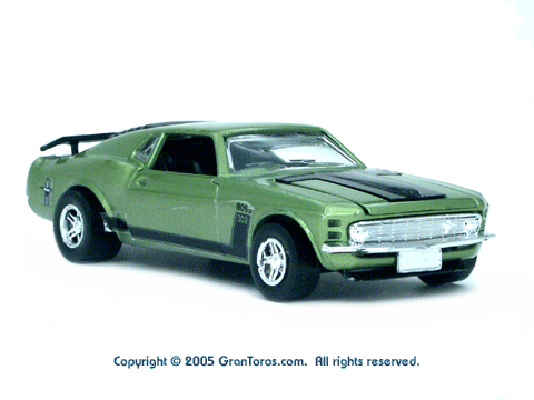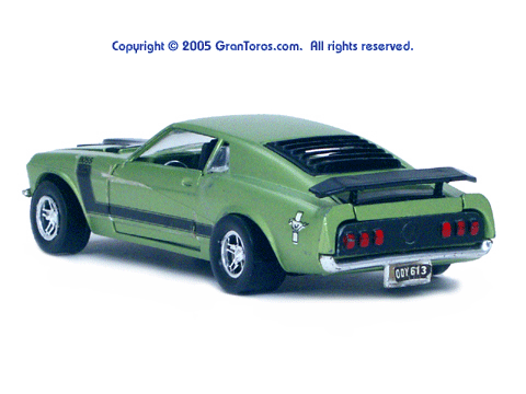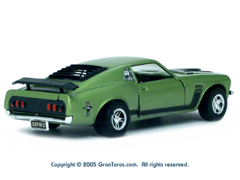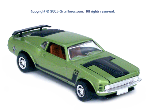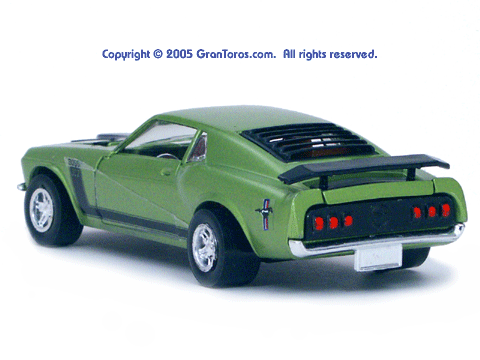 Left rear quarter view of a green Gran Toros Mustang Boss 302 with black interior. This model has Mustang logo decals on the rear quarter panels instead of the normal stickers. |