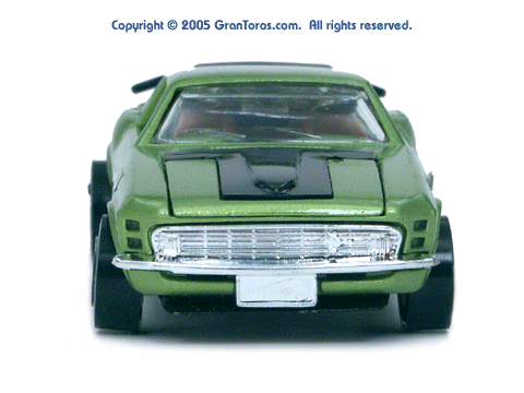Head-on front view of a green Gran Toros Mustang Boss 302 with brown interior. |