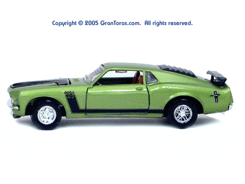 Left side view of a green Gran Toros Mustang Boss 302 with brown interior. |