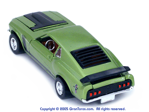 Top right rear quarter view of a green Gran Toros Mustang Boss 302 with brown interior. |