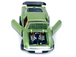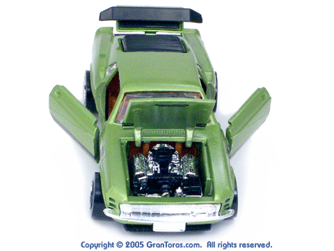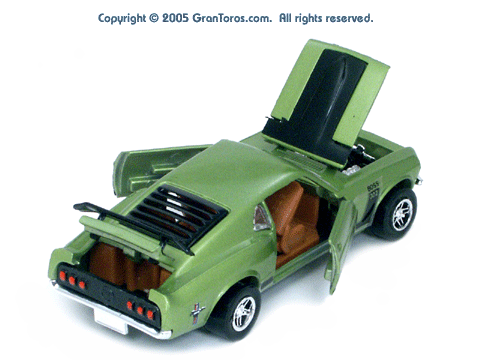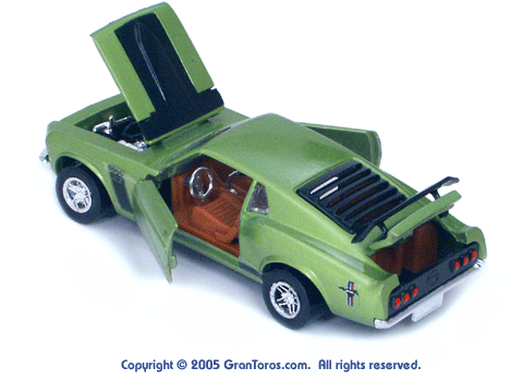 Brown interior green Gran Toros Mustang Boss 302 with open doors, hood and trunk. Both the passenger and driver seats can fold down. |